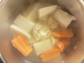 寒の戻り、真冬の寒さになった。古屋の台所、調理するのも寒いので大根と人参を大きく切って、鶏のもも肉1枚といっしょに鍋に入れて、ストーブの上に置いておいた。後からさつまいもを丸ごと入れて、串が通るようになったら出来上がり。ヒトは好みで味付け、...