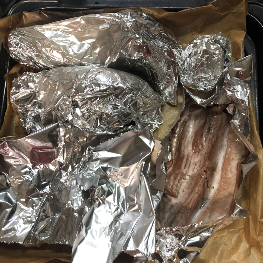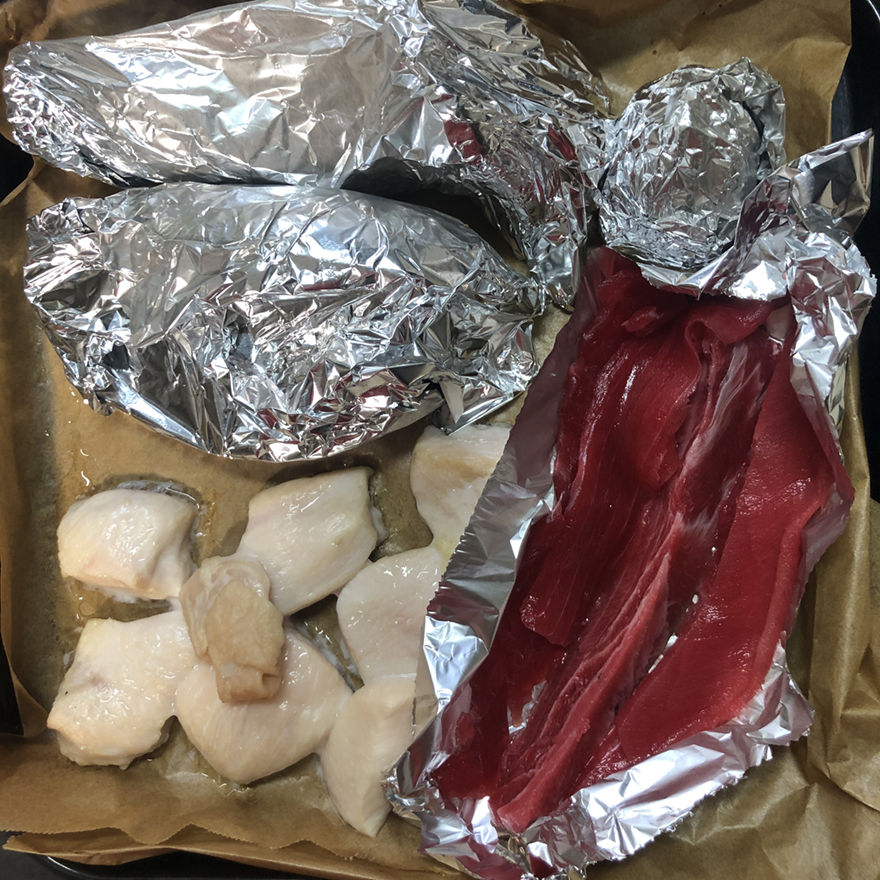 ナスもエリンギもニンニクもアルミホイルで包んで、切った鶏胸肉はそのまま乗せてオーブンに入れ、余熱250度。あったまったら、そのままアルミホイルに乗せたマグロの落としを足して7分焼きます。7分たってもマグロに火が完全に通ってなかったので、鶏胸肉が硬くならないように鶏胸肉の上にアルミホイルで軽く蓋をして3分。