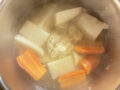 寒い時に限って忙しい。仕事場の石油ストーブに鍋を置いておいて、鶏を茹で、さつまいも、野菜の順番で蒸して行く。鶏はジップロックに入れて茹でるので、鍋を洗うのは簡単。ただ、袋が鍋の縁にくっつくと溶けてしまうので、完全に沈めるか、縁にくっつかないように大きな鍋を使うか注意が必要。